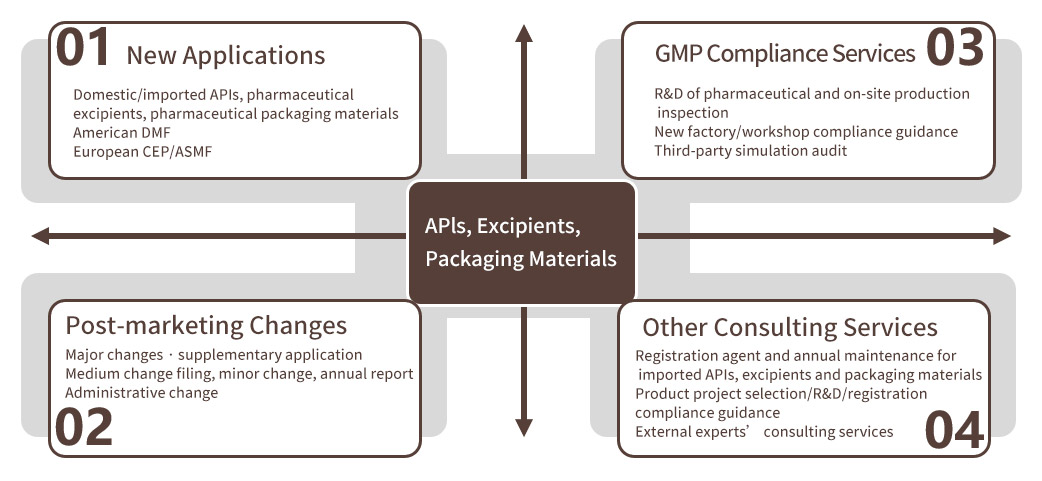 It includes the import registration of DMF products produced overseas to CDE, the export registration of domestic products to Europe and America, and the relevant change and maintenance services of registered products.