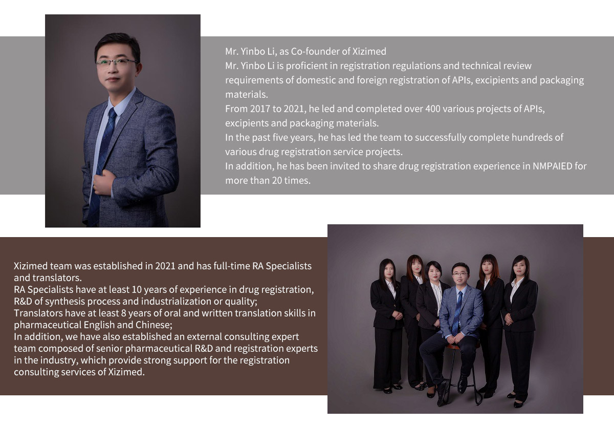 Xizimed is a CRO specializing in registration of APIs, excipients and packaging materials and compliance consulting services, including Shenyang Xizi Biomedical Technology Service Co., Ltd. and its subsidiary Beijing Xizimed Consulting Inc. We are committed to providing domestic and foreign customers with the most professional and precise registration and compliance consulting services for APIs, pharmaceutical excipients and packaging materials, to build the most time-saving and labor-saving approaches of listing.