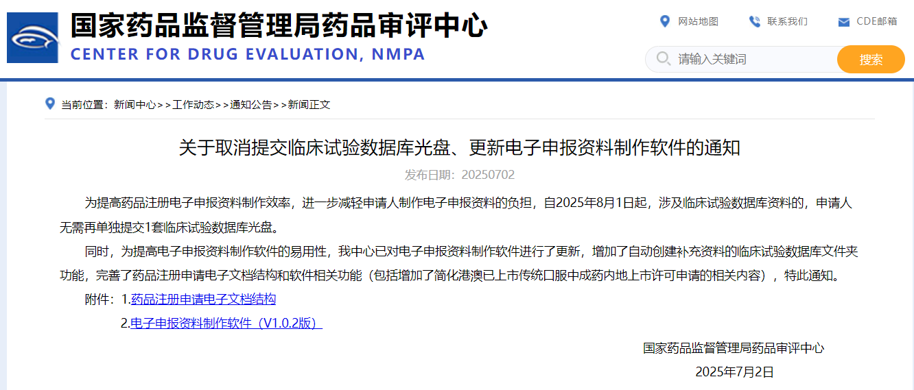 To enhance the efficiency of preparing electronic application dossier for drug registration and further reduce the burden on applicants, applicants will no longer be required to submit a separate CD-ROM containing clinical trial database as of August 1, 2025.